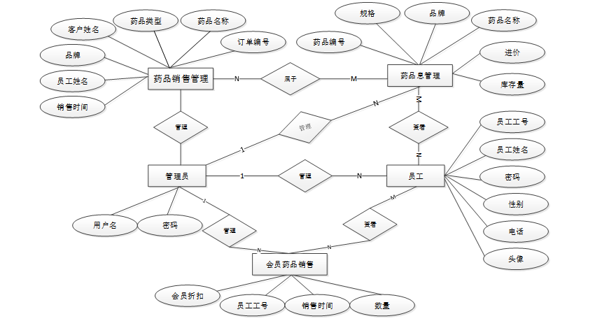 在药店销售管理系统的数据库设计中,系统E-R模型的设计可以展示数据库中各种实体信息和他们之间的关系,将药店销售管理系统的E-R模型研究好后,数据库中数据表的建立也会比较容易。