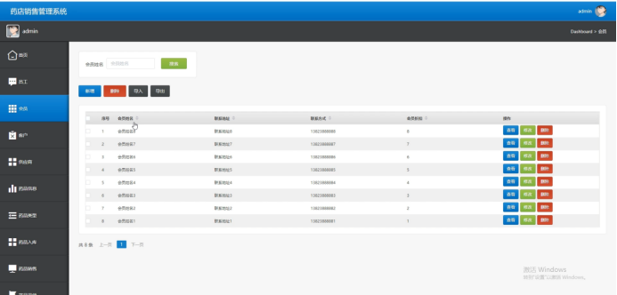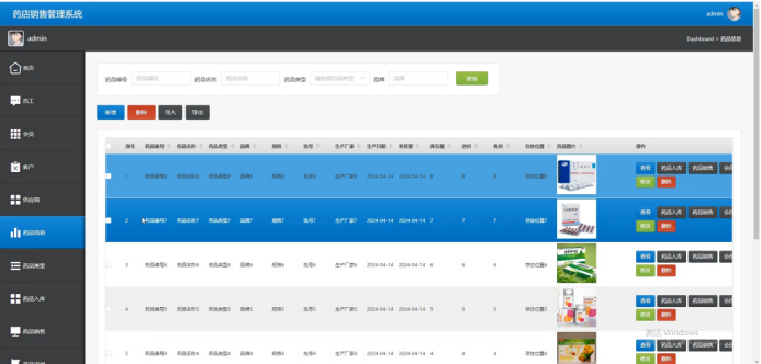 药品信息;在药品信息页面输入药品编号、药品名称、药品类型、品牌进行搜索、新增、删除、导入、导出药品信息列表,并对药品信息详细信息进行查看、药品入库、药品销售、会员销售、修改或删除操作;如图5-6所示: