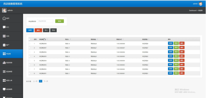 供应商;在供应商页面输入供应商名称进行搜索、新增、删除、导入、导出供应商列表,并对供应商详细信息进行查看、修改或删除操作;如图5-5所示: