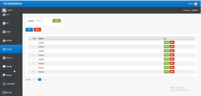 药品类型;在药品类型页面输入药品类型进行搜索、新增或删除药品类型列表,并对药品类型详细信息进行查看、修改或删除操作;如图5-7所示: