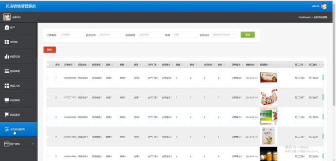 会员药品销售;在会员药品销售页面输入订单编号、药品名称、药品类型、品牌、会员姓名进行搜索或删除会员药品销售列表,并对会员药品销售详细信息进行查看、修改或删除操作;如图5-9所示:
