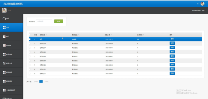 药品信息;在药品信息页面输入药品编号、药品名称、药品类型、品牌进行搜索药品信息列表,并对药品信息详细信息进行查看、药品入库、药品销售、会员销售操作;如图5-13所示: