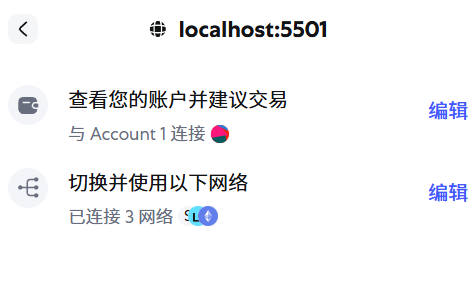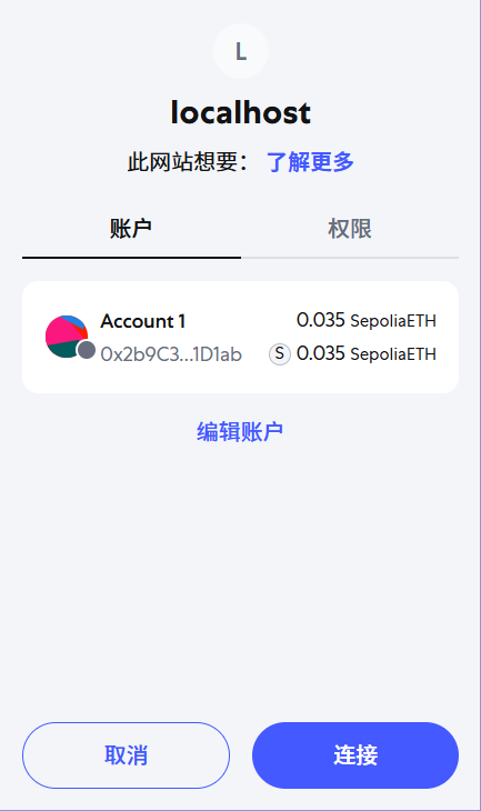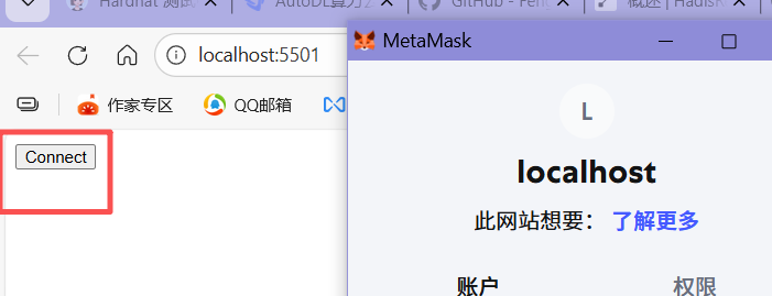 然后浏览器就会自动弹出,选择一个账户,连接钱包。再打开钱包插件,会显示已连接,这意味着网站可以对 MetaMask 进行 API 调用了。