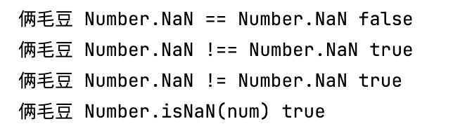 console.log("俩毛豆 Number.NaN == Number.NaN true");