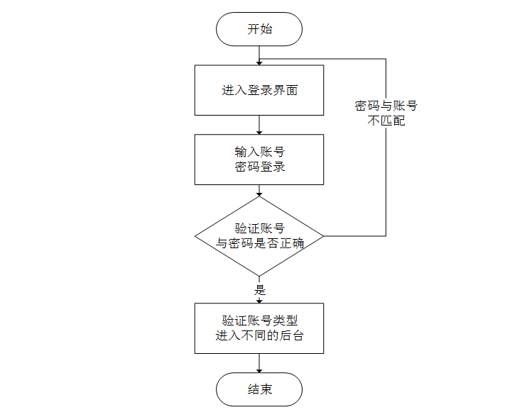 登录流程是该系统的第一个流程,登录的第一步是输入账号、密码登录,系统会验证账号与密码是否正确,正确时系统会判断账号类型再进入不同的后台;不正确时,会返回到登录的第一步,输入用户重新执行登录流程。该流程如图3-1所示。