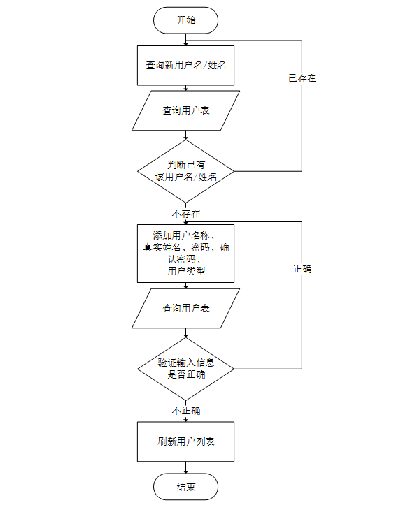 添加新用户的流程是先查询新用户名是否已存在,如已有该用户名,需重拟用户名并同时输入新用户的其它信息,添加新用户到数据库时会先验证数据是否完整,信息都正确且完整时,返回并刷新用户列表;信息不正确时,会返回输入信息的那一步。该流程如图3-2所示。