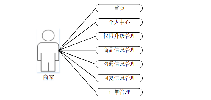 商家关键功能包含对首页,个人中心,权限升级管理,商品信息管理,沟通信息管理,回复信息管理,订单管理等进行详细操作。商家用例如下:
