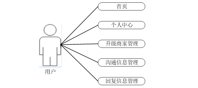用户关键功能包含对首页,个人中心,升级商家管理,沟通信息管理,回复信息管理等进行详细操作。用户用例如下: