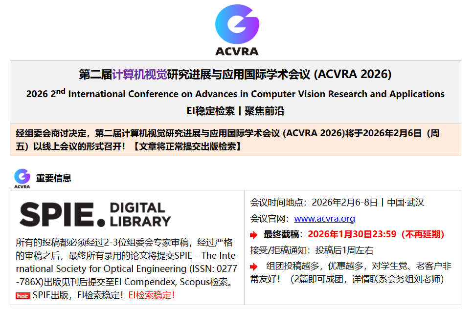 论文投稿: 第二届计算机视觉研究进展与应用国际学术会议 (ACVRA 2026) 大会官网:https://ais.cn/u/2YrM7j 大会时间:2026年2月6-8日 大会地点:中国-武汉