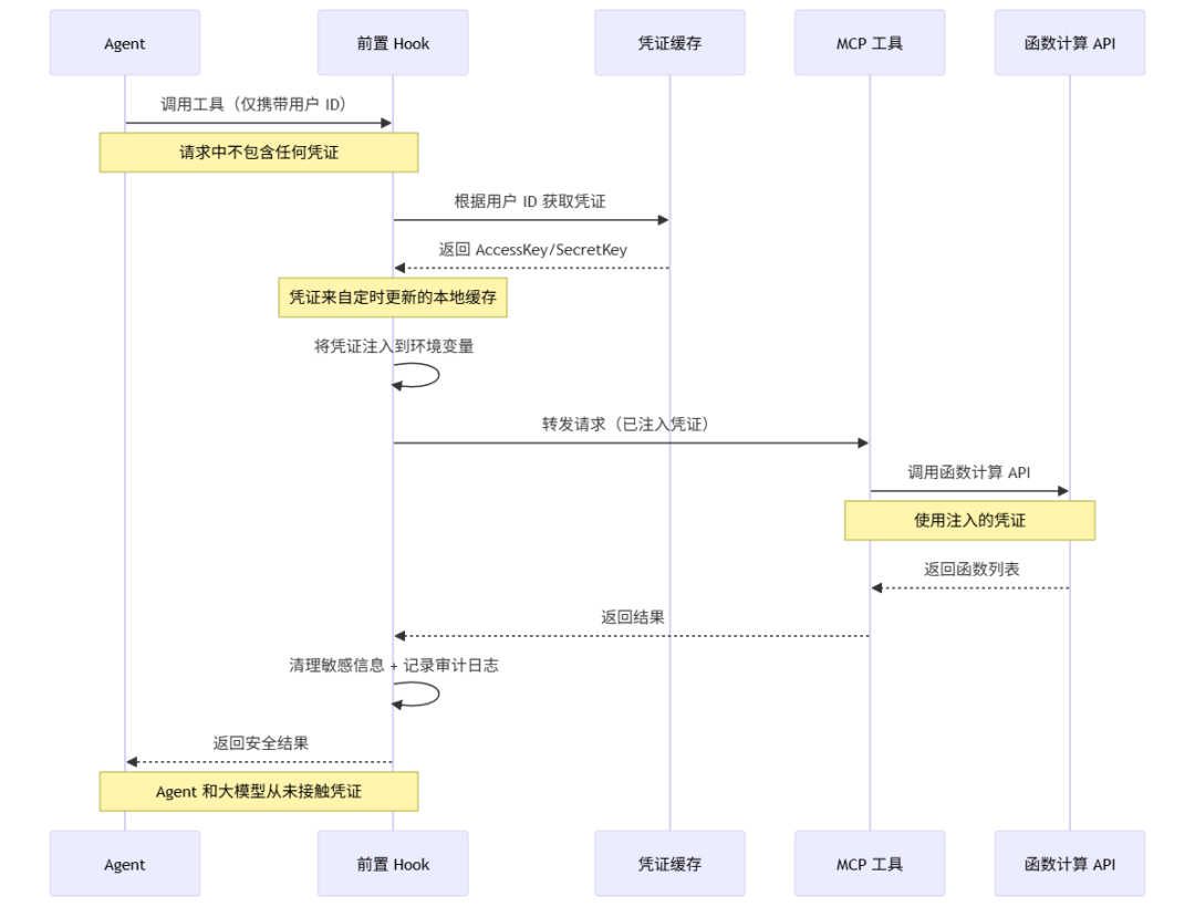 **函数计算 AgentRun 通过前置 Hook 实现了优雅的动态凭证注入。**用户在平台上配置自己的出站凭证后,Agent 调用工具时请求中只携带用户 ID,不包含任何凭证信息。前置 Hook 拦截请求,根据用户 ID 从凭证库获取对应的凭证,然后将凭证注入到环境变量或请求参数中。工具使用注入的凭证执行实际操作,后置 Hook 再清理敏感信息并记录审计日志。整个过程中,凭证从未暴露给大模型,也不会出现在 Agent 的代码中,真正做到了安全可控。