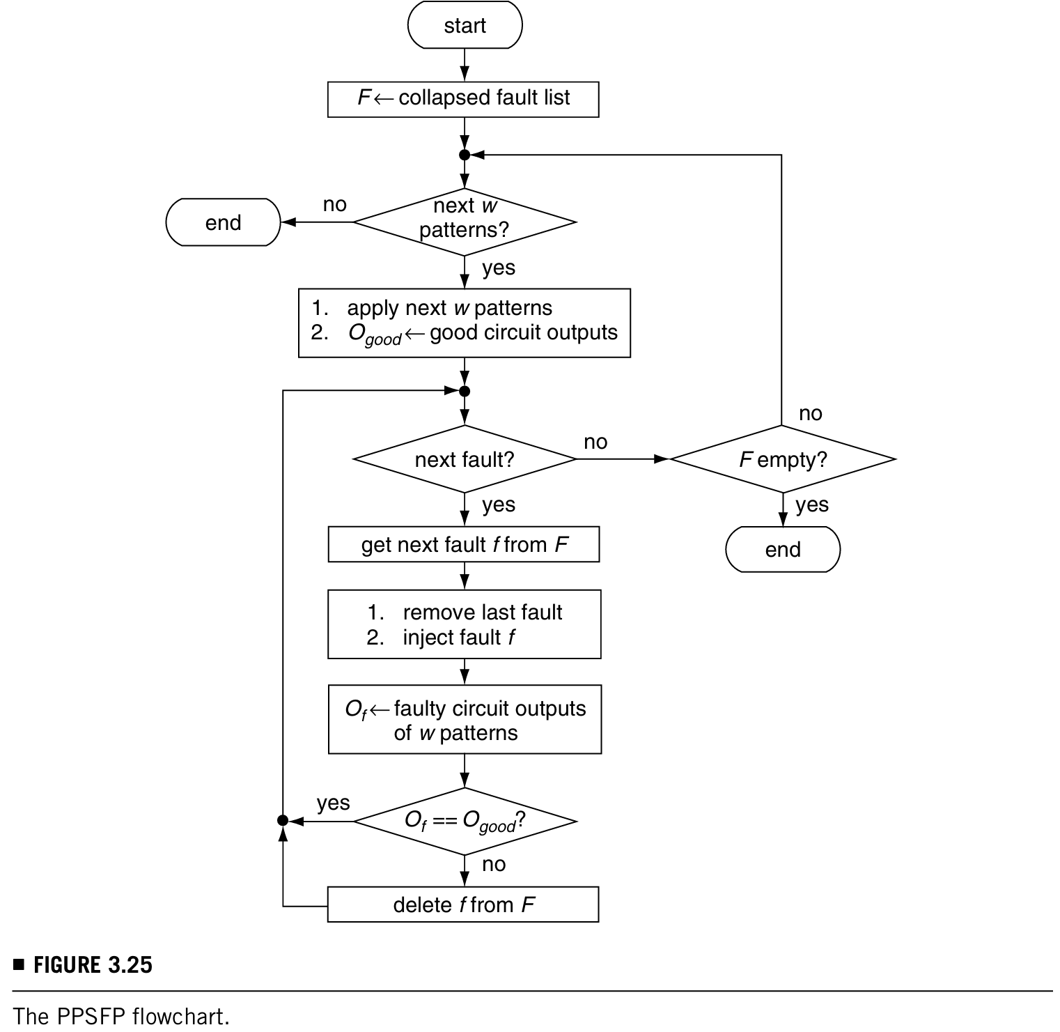 先仿真fault-free电路,记下它的输出,然后每次仿真一个故障电路,与fault-free输出对比确认故障是否被检测到。PPSFP的过程如下图: