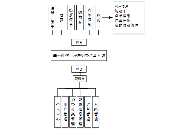 基于微信小程序奶茶点单系统的实现是由不同的功能模块搭建组合而来,根据功能模块进行划分不同用户角色所操作信息及获取到的数据信息根据权限不同,需要根据用户需求对功能模块的内容进行设计开发。
