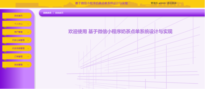 管理员登录进入基于微信小程序奶茶点单系统,可以对个人中心、用户管理、奶茶分类管理、奶茶信息管理、订单管理、系统管理等功能模块进行相应权限的操作,如图5-2所示。