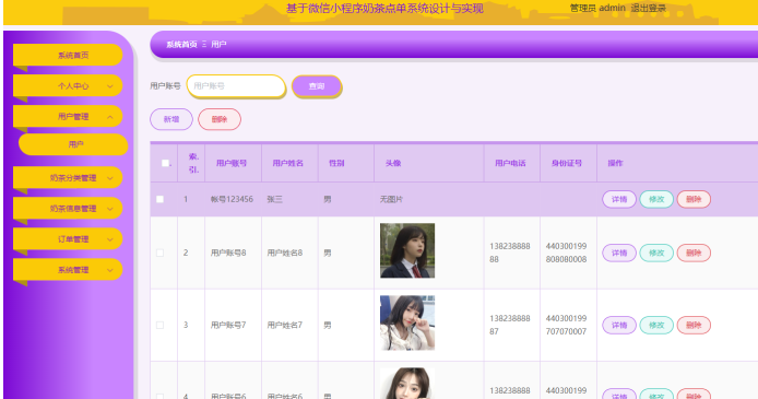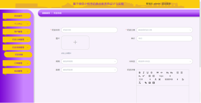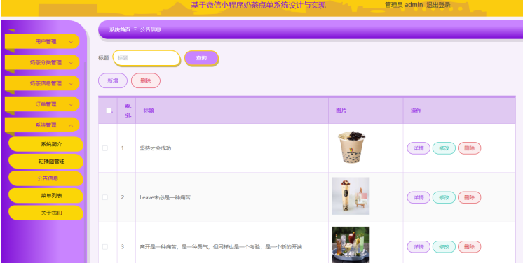 管理员后台管理:管理员可以管理用户信息、奶茶分类、奶茶信息、订单状态以及公告信息等。