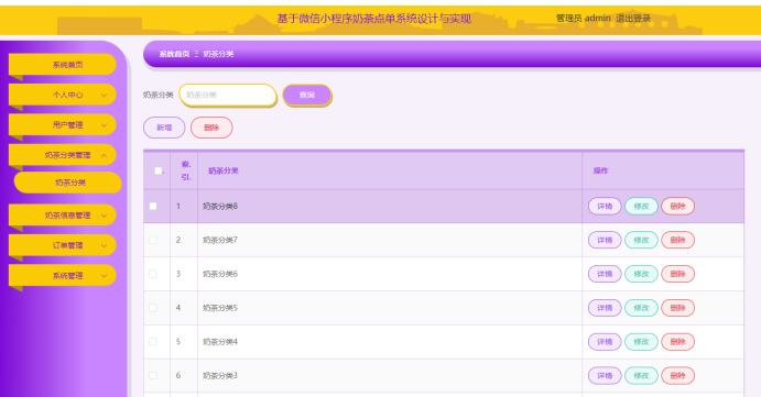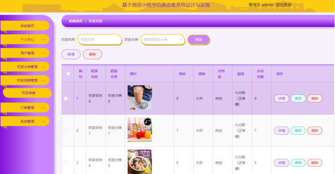 管理员在奶茶信息管理页面,可以通过输入奶茶名称、奶茶分类进行查询,对系统已有奶茶信息进行查看详情、修改、删除、新增等操作,如图所示。