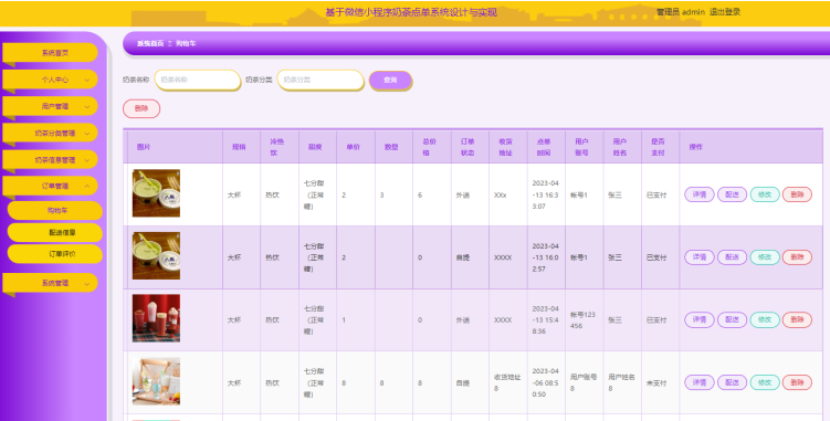 管理员通过点击订单管理,可以对购物车、配送信息、订单评价进行相关操作,进入到购物车操作页面,可以通过输入奶茶名称、奶茶分类进行查询,并进行在线查询、修改、删除、配送等操作,订单管理页面图5-7所示。