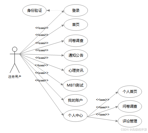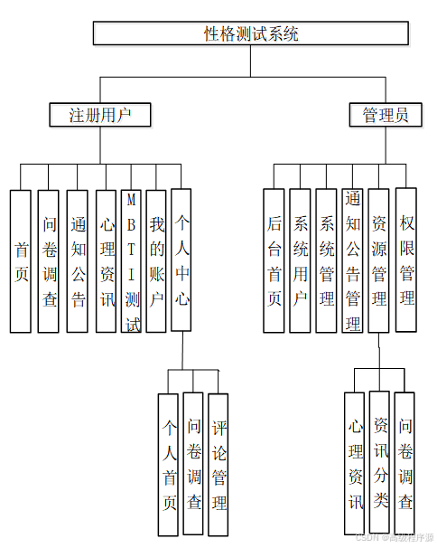 性格测试系统包含注册用户、管理员两个角色,主要功能如下: