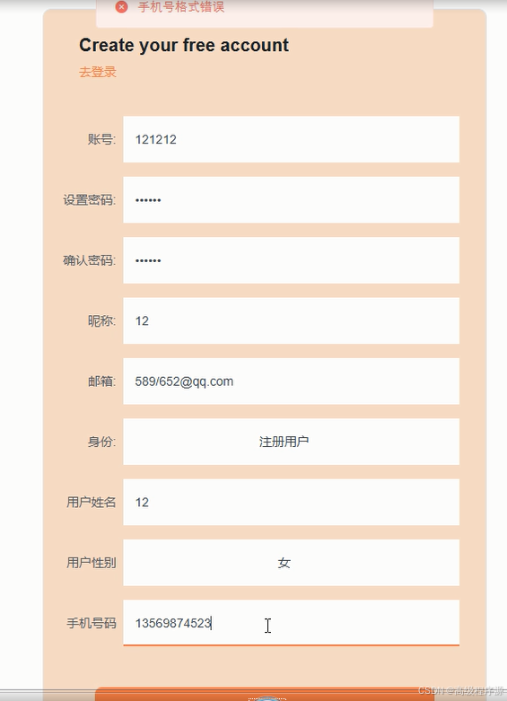 用户注册:输入账号、设置密码、确认密码、昵称、邮箱、选择用户身份、用户姓名、用户性别、联系电话等用户个人信息,点击注册按钮进行注册,用户注册界面如下图所示。