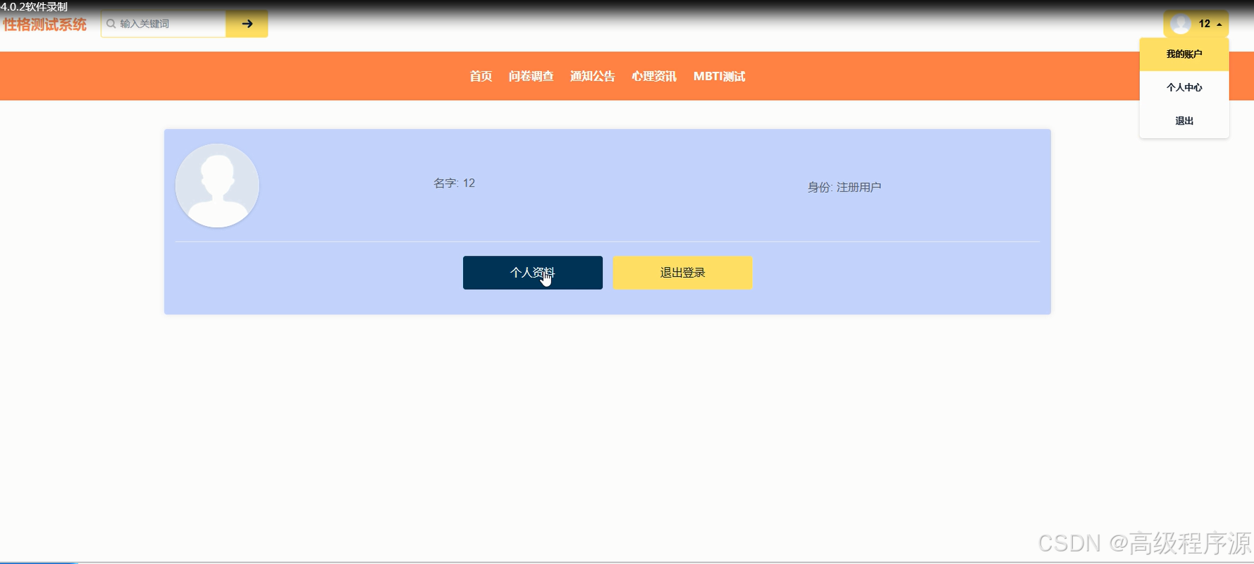个人首页:展示用户的基本信息、参与的问卷和测试记录,提供用户的整体活动概览。