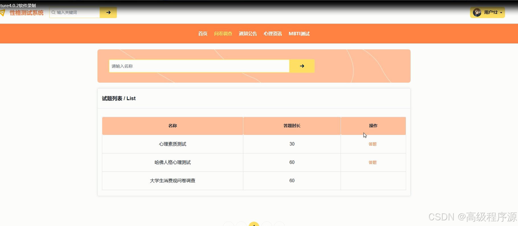 在问卷调查模块,注册用户可以参与性格测试和心理健康评估。系统提供多种问卷,用户可以根据自身需求选择填写。问卷设计直观,回答过程简单方便,用户提交后可以查看自己的测试结果和分析。问卷调查如下图所示。