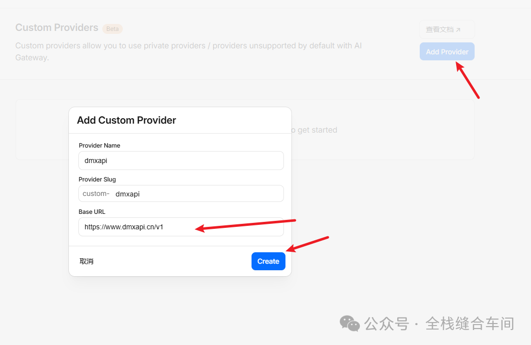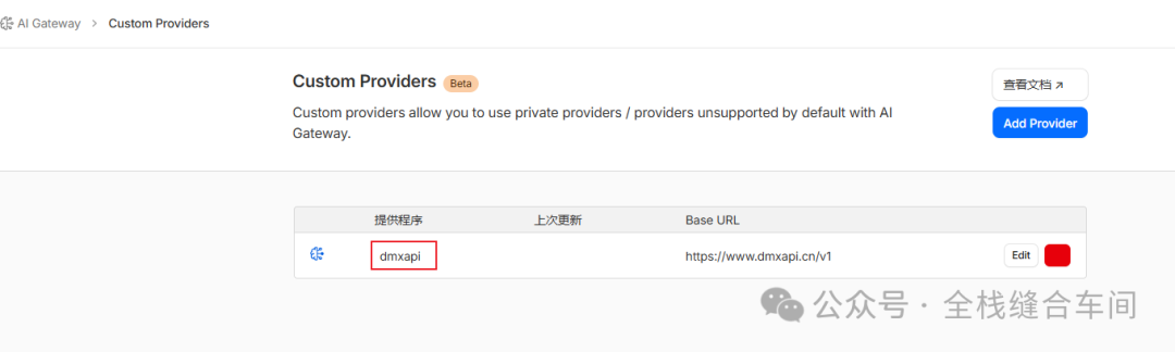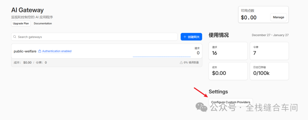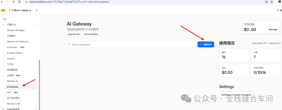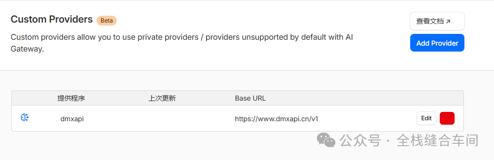 我们回到ai gateway的首页: https://dash.cloudflare.com/?to=/:account/ai/ai-gateway 可以看到网关创建好了,我们点击配置自定义服务商:
