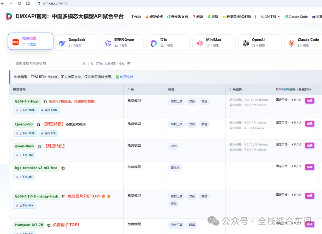 我这里以某个newapi开发的大模型分发站为例做演示,我这里用的是https://www.dmxapi.cn/,有免费的模型可供测试之用:
