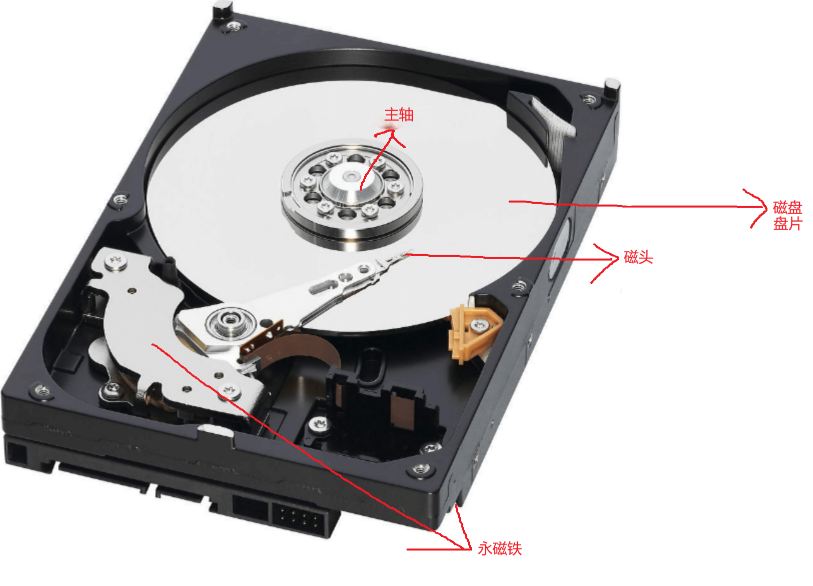 磁盘的核心硬件由盘片、磁头、电机、控制电路板等组成,其中磁头就相当于磁盘的笔,磁盘盘片相当于纸,其存储原理以磁介质为基础:盘片表面涂有可磁化的磁性涂层,被划分为无数独立磁畴单元,在主轴马达带动下,盘片高速旋转,在需要写入的位置通过磁头产生的定向磁场改变磁畴磁极方向,以此表示二进制 0 和 1,实现数据写入;读取时则利用电磁感应,通过磁畴磁极切割磁头线圈产生的不同方向感应电流,还原二进制数据,且磁化后的磁极方向断电后不消失,具备天然的非易失性。