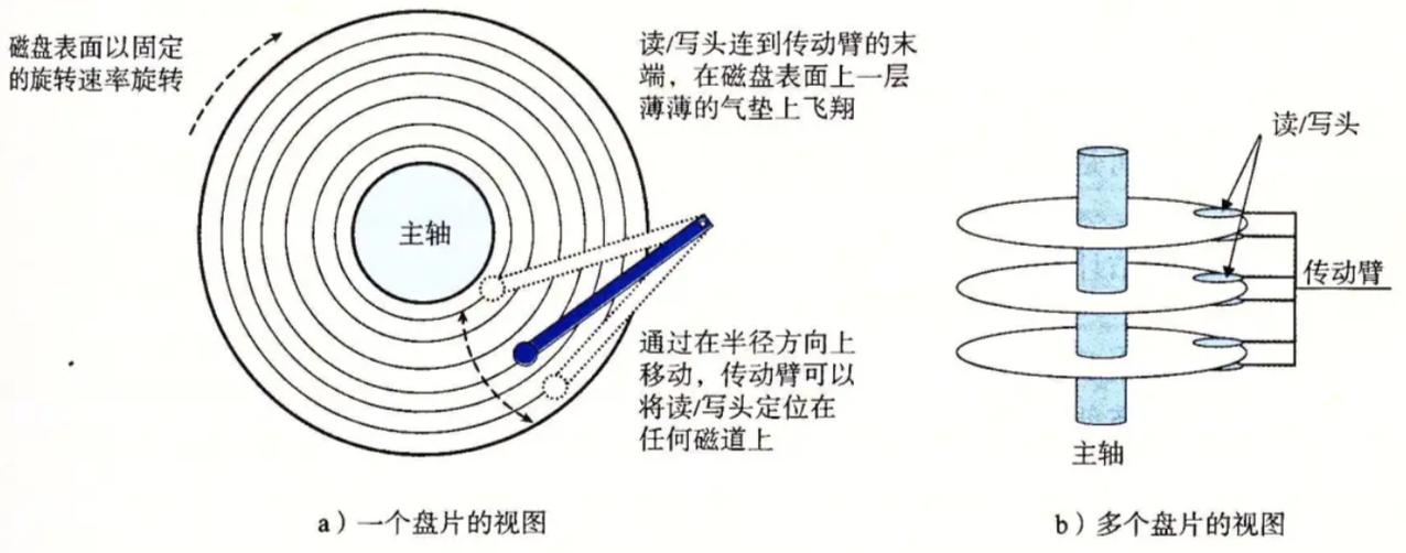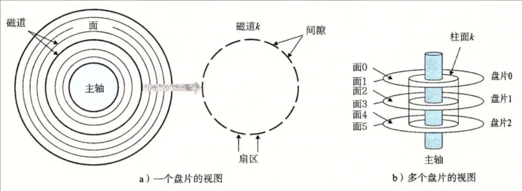 对于多个盘片组成的圆柱体结构,而对于所有盘片同一磁道构成的集合圆柱体成为柱面,且每个存储面都配备独立的磁头,主轴马达则为所有盘片提供统一的高速旋转动力,所有磁头在传动臂的统一带动下进行不同磁道(柱面)之间的切换,马达与传动臂共同构成协同工作的存储机械结构。