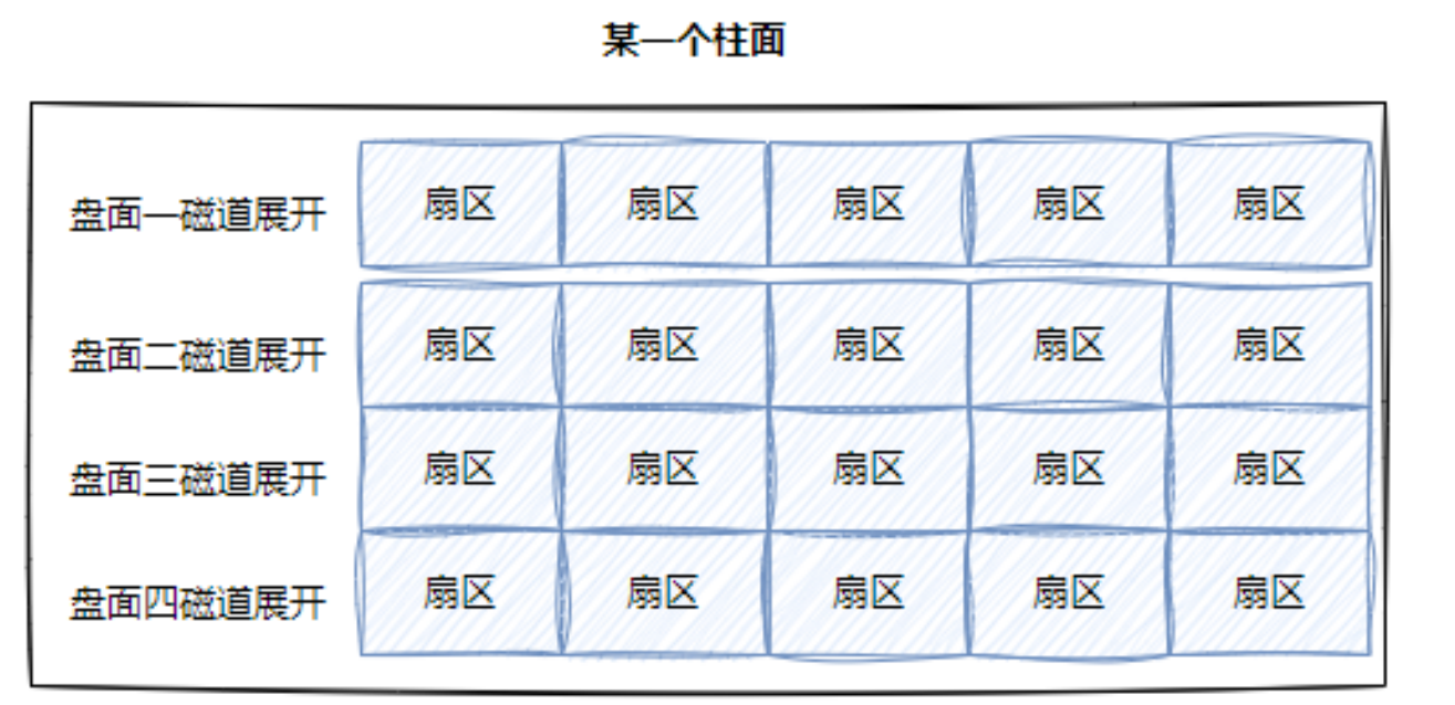 那么对于整个立体磁盘结构,虽然磁盘是由多个盘面形成的物理结构,但是我们用柱面的概念可以把整个磁盘转化成由所有柱面“卷起来”的等价模型