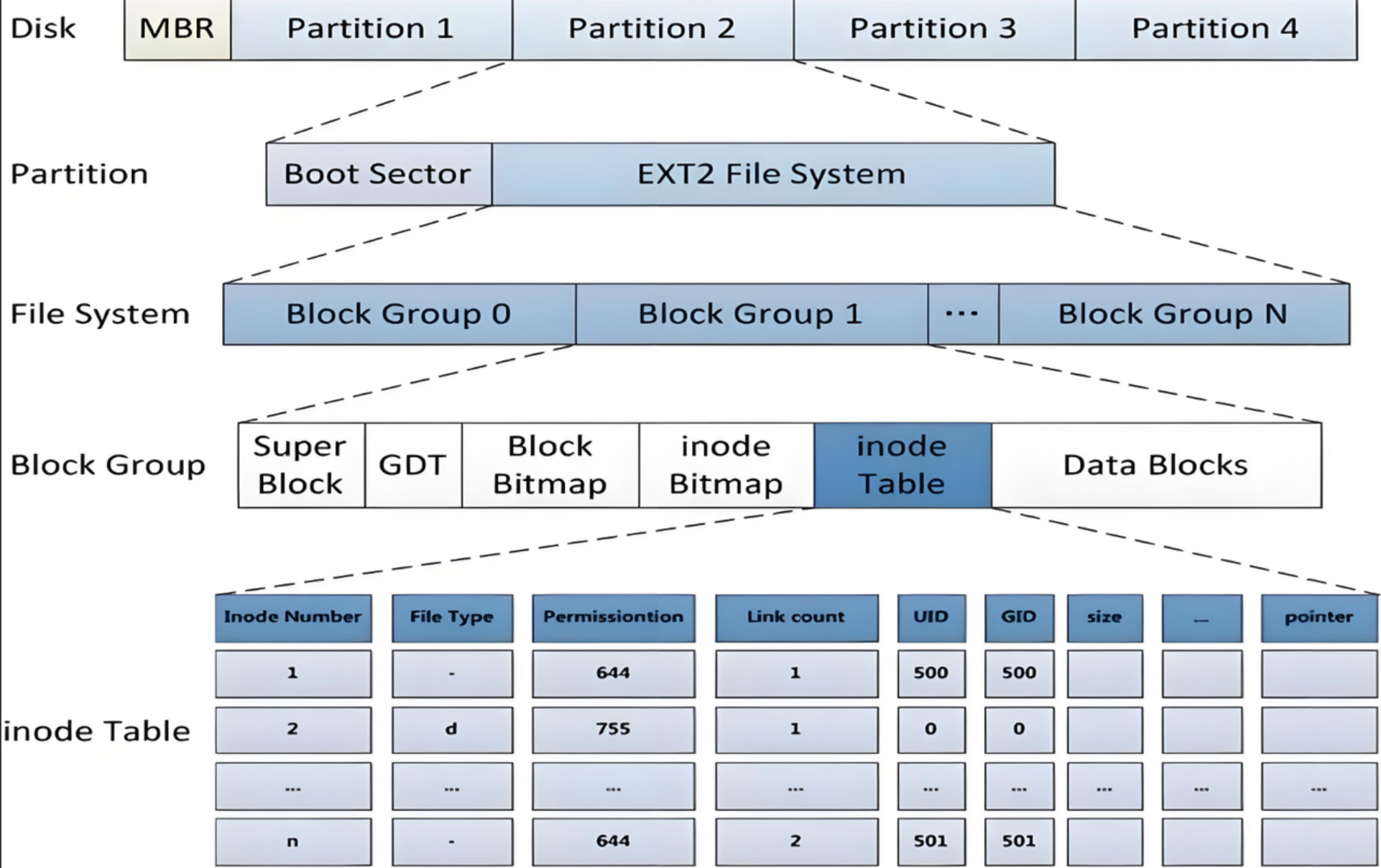 块组描述符表,描述块组属性信息,整个分区分成多个块组就对应有多少个块组描述符。每个块组描述符存储⼀个块组 的描述信息,如在这个块组中从哪⾥开始是inode Table,从哪⾥开始是Data