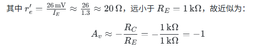 电压增益公式(忽略 rπ影响,且无发射极旁路电容时):为啥前面带负号,实际意思是相位相反,输出滞后于输入180°