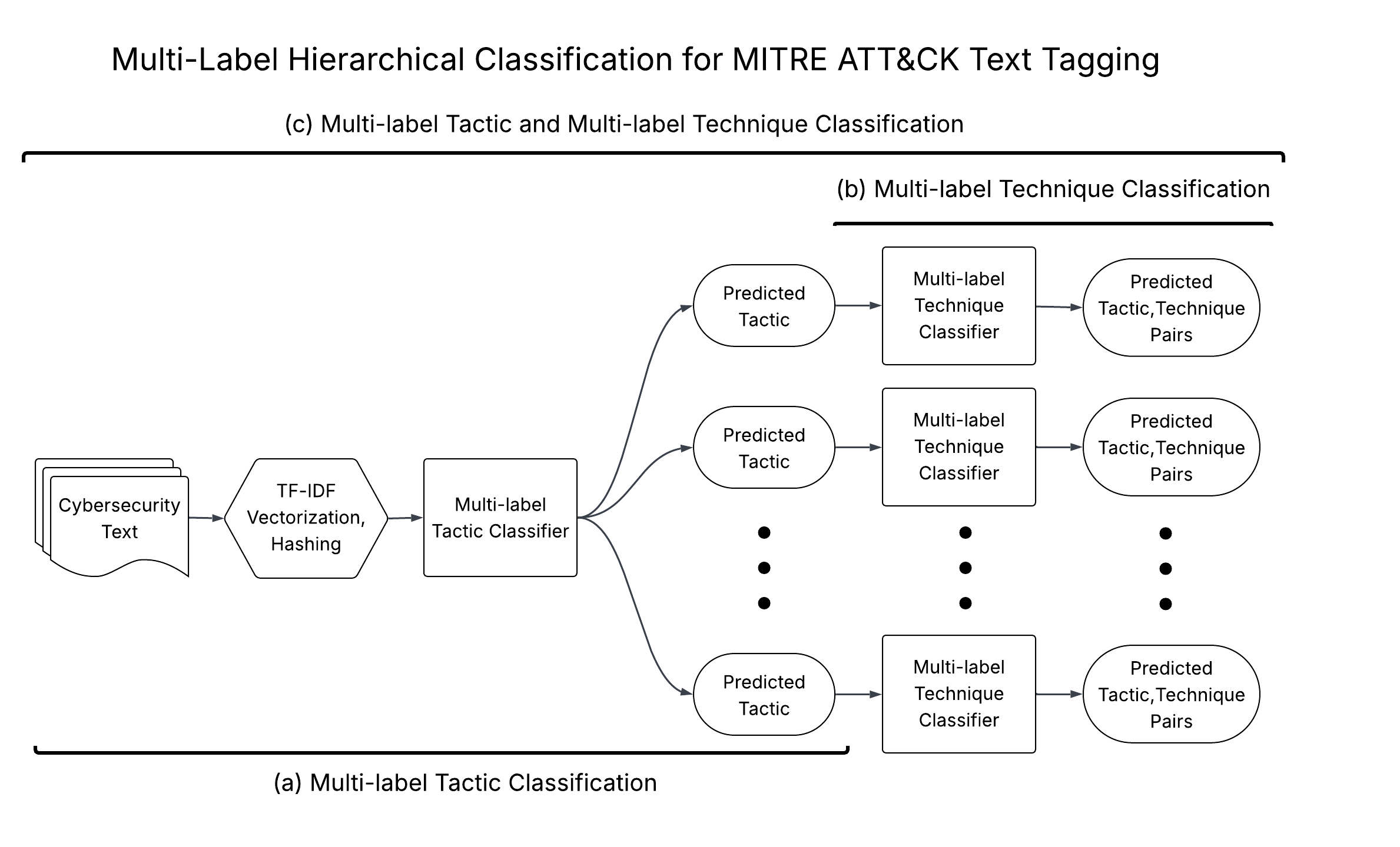 在本技术说明中,我们首先提供了 MITRE ATT&CK 文本标注任务的通用“任务空间”表述,用以组织现有的人工智能/机器学习相关工作并促进进一步发展。该表述为我们“自下而上”分阶段为通用网络情报文本构建基线多标签分层标注系统提供了结构,因为我们基于实验结果在任务空间层次上逐步升级。我们的系统构建过程避开了规范的“自上而下”的人工智能/机器学习建模倾向,转而采用 CISA 为分析师指南中指定的“MITRE ATT&CK 映射最佳实践”。在我们的系统构建过程中,我们展示了我们的基线模型在多类战术预测上优于 GPT-4o。我们还展示了如何重新使用基线模型来引导新数据集的建模——在由 JPMC 内部安全专家为金融应用生成的一组威胁场景上例证了这种重新使用。我们还实现了一种保持模型性能的哈希方法,以支持我们向安全社区公开释放可供下载和使用的标注系统。
