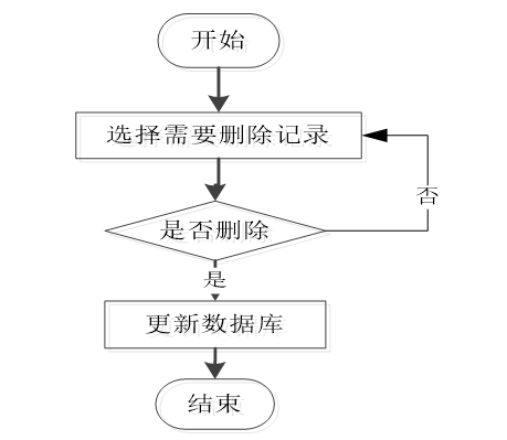 最后为删除信息页面。进入该页面后,用户可以对所要删除的信息进行选择,选择好删除的内容后,会有一个“是否确认删除”的提示框,操作者可以根据自己的意愿来选择“是”或“否”。完成上述操作,系统会自动的对删除的内容进行判断,如果符合删除要求则会成功删除数据记录,并且更新数据库的内容信息;如果删除的数据记录不符合要求,则会有一个“删除失败”的提示框,操作人员需要根据提示来进行修改,修改完成后重新删除知道删除成功。删除信息流程图如图3-3所示: