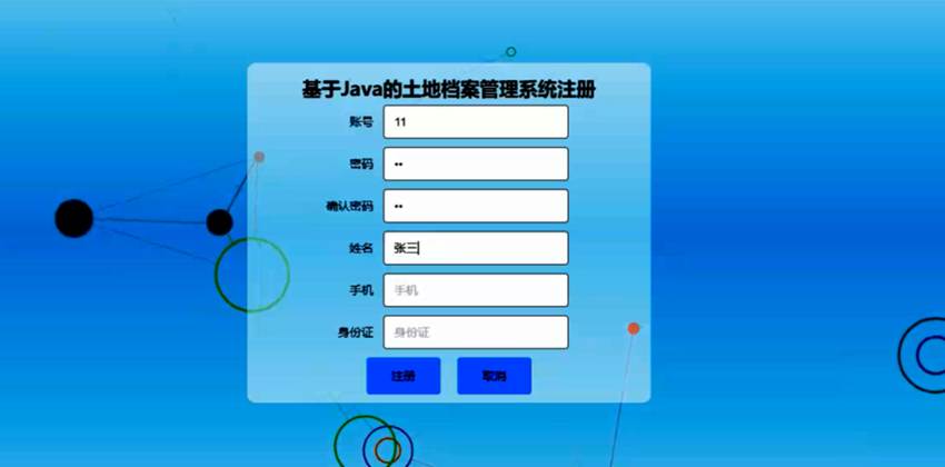 用户用户如果需要进入土地档案管理系统,则需要进行注册;点击注册用户,通过输入账号、密码、姓名、手机、身份证等信息进行注册。用户注册页界面如图5-1所示: