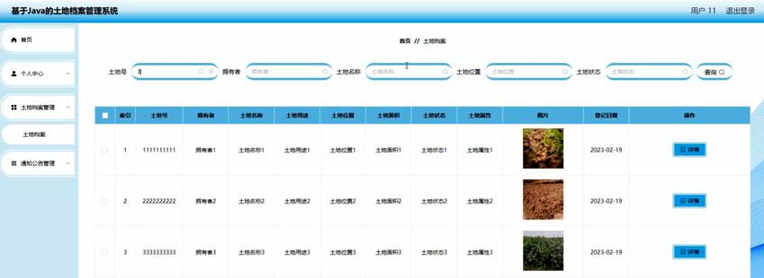 系统核心功能包括个人中心、用户管理、土地档案管理、通知公告管理等模块。用户可注册登录、维护个人信息、查询土地档案(含土地号、拥有者、用途、位置、面积、状态、详情等)、查看通知公告;管理者可新增、修改、删除土地档案与通知公告,管理用户账号信息,维护系统配置。土地档案支持上传图片、记录登记日期与归属性质,通知公告可发布标题、简介、内容与图片。这些功能全面覆盖了土地档案从建档、更新、查询到公告发布的全流程,实现了土地档案管理的信息化、规范化与便捷化,为用户提供了高效的档案查询渠道,为管理者减轻了人工管理负担。