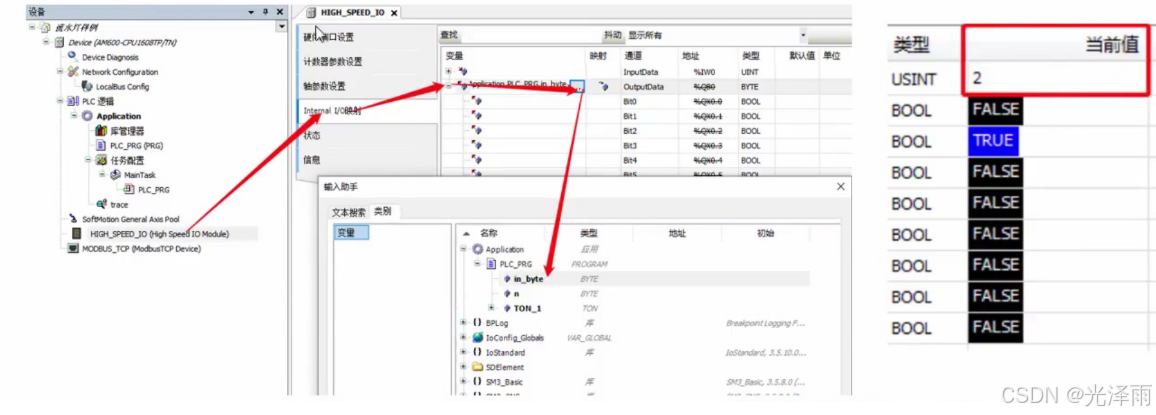 in_byte变量映射到PLC的8路输出端口(Bit0-Bit7)