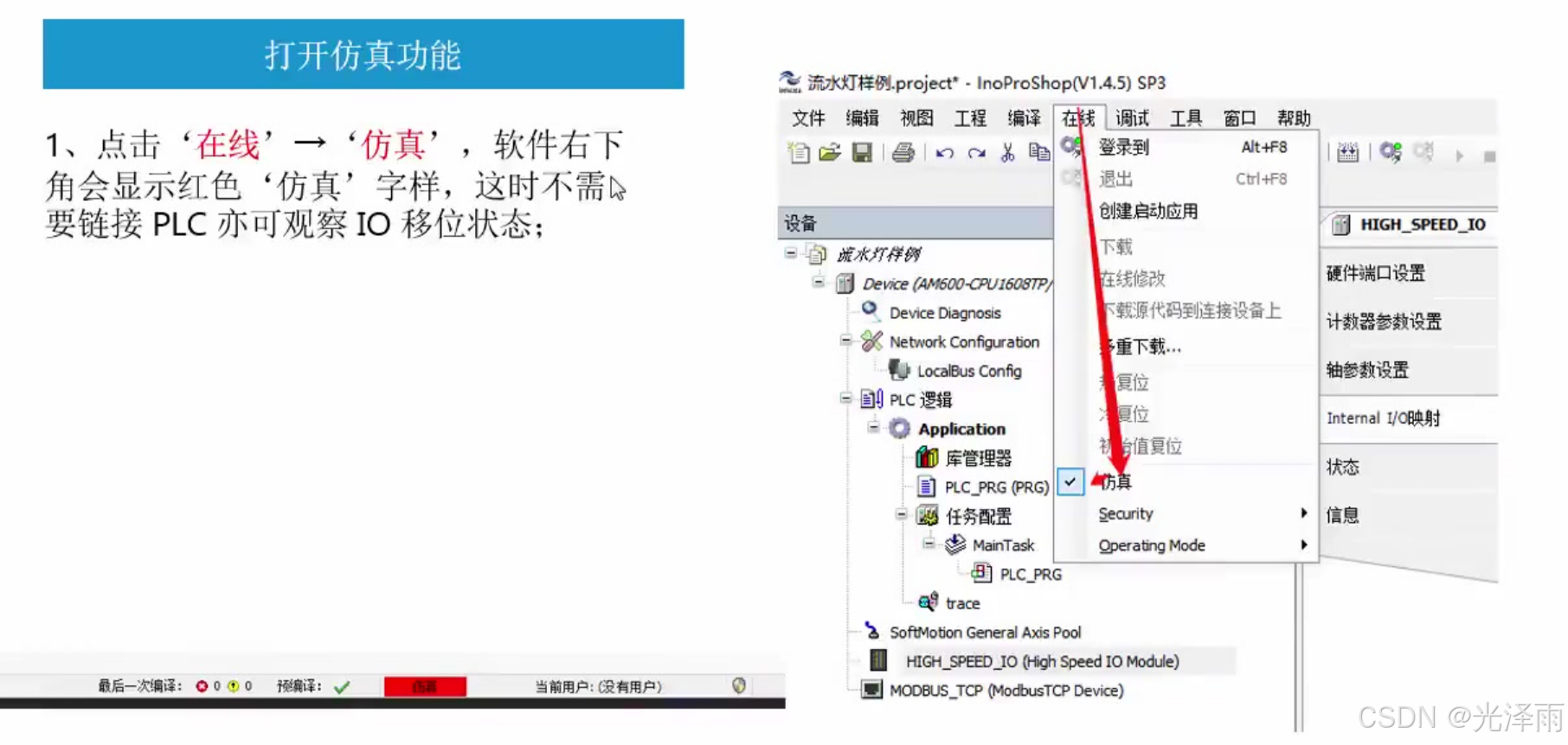 启用方法:点击"在线"→"仿真",右下角显示红色"仿真"字样