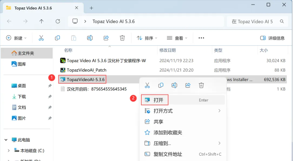 20、回到Topaz Video AI 5.3.6文件夹,找到【TopazVideoAI_Patch】文件,右键点击【复制按钮】