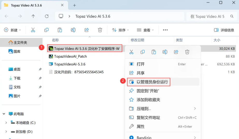 22、找到粘贴的【TopazVideoAI_Patch】文件,再右键选择【以管理员身份运行】它