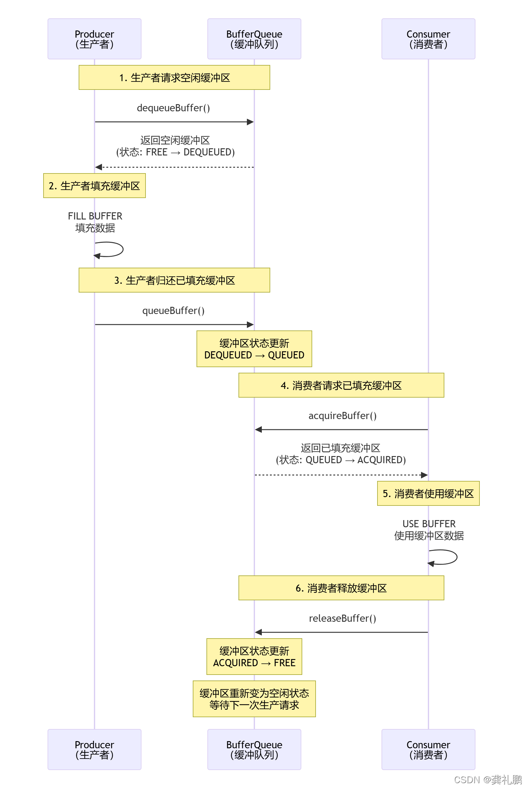 - 真正意义上的释放 是指缓冲区从 ACQUIRED 状态成功迁移到 FREE 状态,并被加入到空闲缓冲区集合中。随后通过回调通知生产者,从而完成一个“释放-申请-使用”的完整循环。