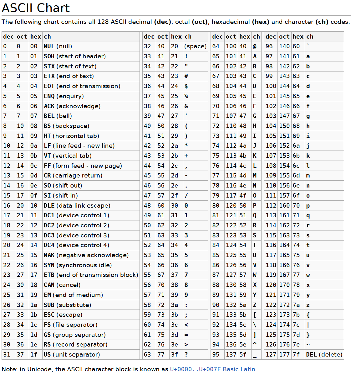计算机中所有数据(包括字符)以二进制的形式存储,而ASCII码表中记录的就是每个字符的对应编码(128个)