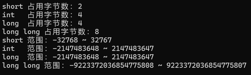 cout << "short 范围:" << SHRT_MIN << " ~ " << SHRT_MAX << endl;