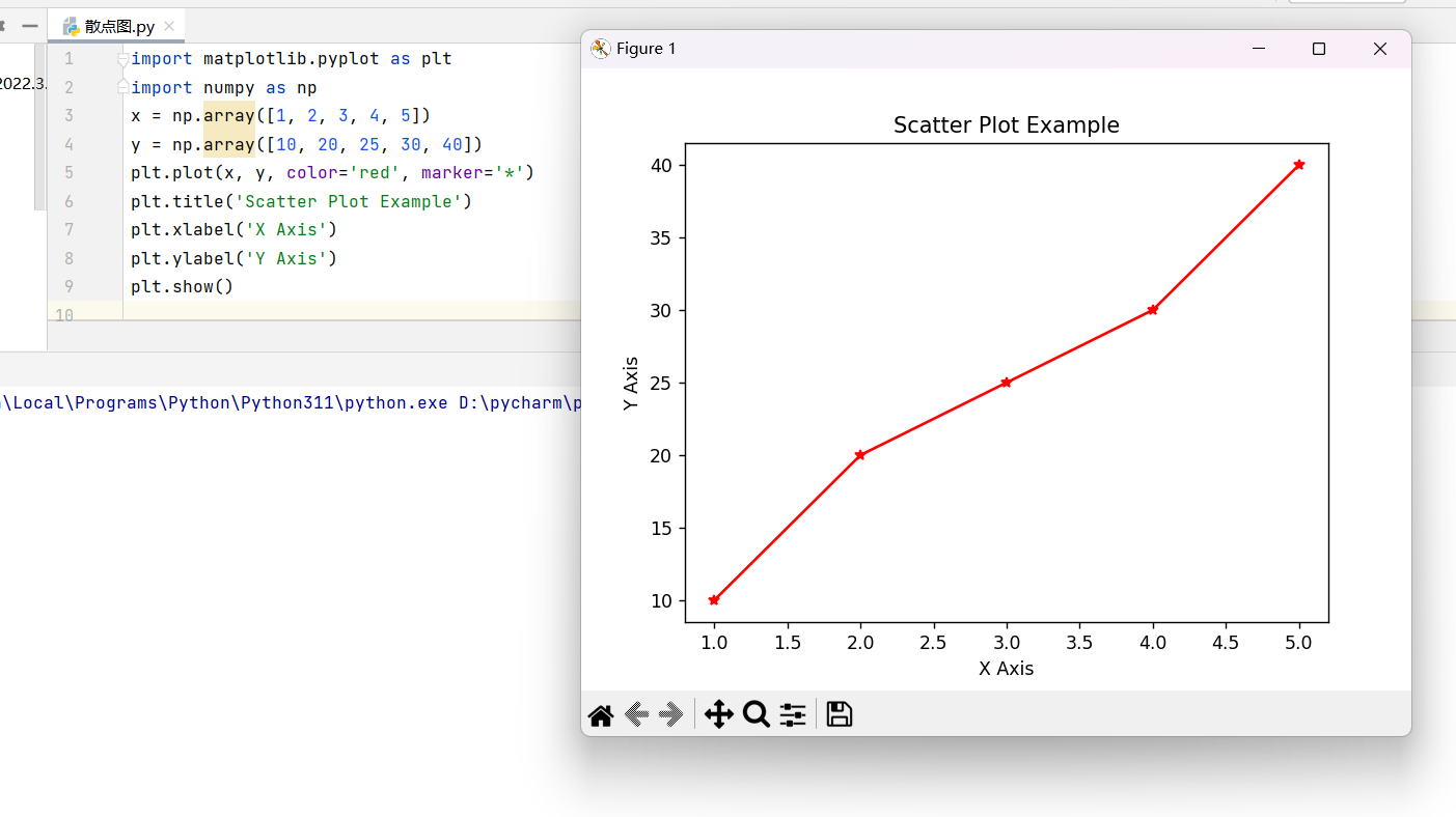 运行这段代码,你就能看到一个带星型标记的红色散点图,非常直观。