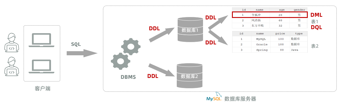 SQL:结构化查询语言。一门操作关系型数据库的编程语言,定义操作所有关系型数据库的统一标准。SQL语句根据其功能被分为四大类:DDL、DML、DQL、DCL 。