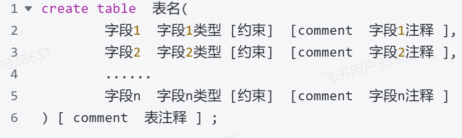 - 注意: [ ] 中的内容为可选参数; 最后一个字段后面没有逗号