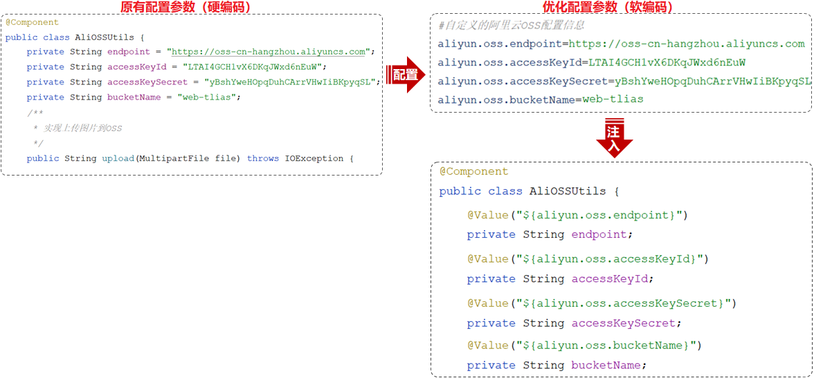 我们在application.yml中配置了阿里云OSS的四项参数之后,如果java程序中需要这四项参数数据,我们直接通过@Value注解来进行注入。这种方式本身没有什么问题,但是如果说需要注入的属性较多(例:需要20多个参数数据),我们写起来就会比较繁琐。