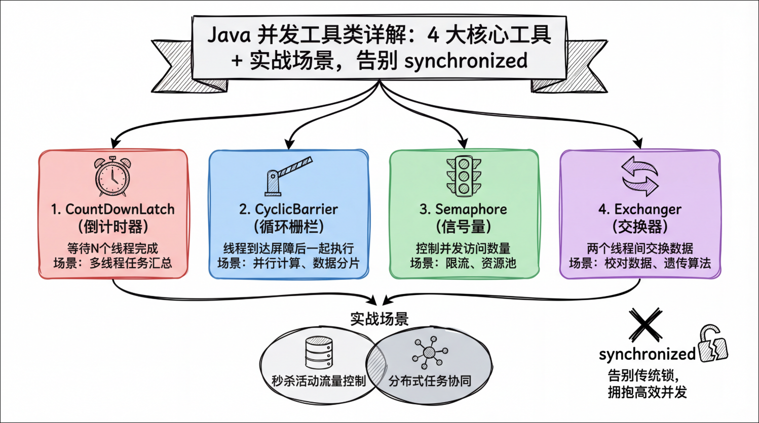 在 Java 并发编程中,synchronized虽然能解决线程同步问题,但功能单一、灵活性差,面对复杂场景(如多线程等待、流量控制、数据交换)时力不从心。JDK 提供的CountDownLatch、CyclicBarrier、Semaphore、Exchanger四大并发工具类,基于 AQS(队列式同步器)实现,能更优雅地处理各类并发场景。本文用 “生活场景 + 代码示例” 的方式,带你吃透这 4 个工具类,面试和工作都能用得上!