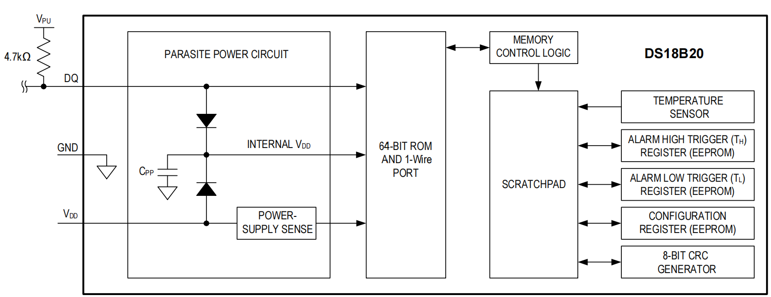 现在,我们清楚了DS18B20三个存储器中,ROM存放“身份证号”,暂存器存放温度数据、报警阈值和配置数据,EEPROM“存钱”,如此多功能,如此多数据,我们来看看势单力薄的DQ引脚是如何连接两者的。