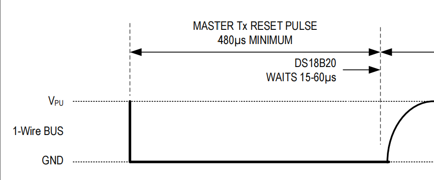 左边部分是复位脉冲,先拉低总线(DQ)最少480微秒,代码中拉低了750微秒;之后再缓慢拉高