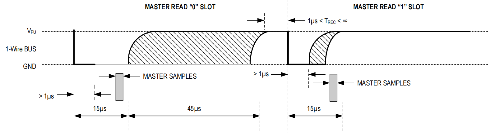 单片机要从DS18中读取数据,需要自己产生一个60微秒的“读取时隙”,且时隙之间需预留至少 1µs 的恢复时间。主设备通过将单线总线拉低至少 1µs 来触发读取时隙(即上图的“L”黑线)